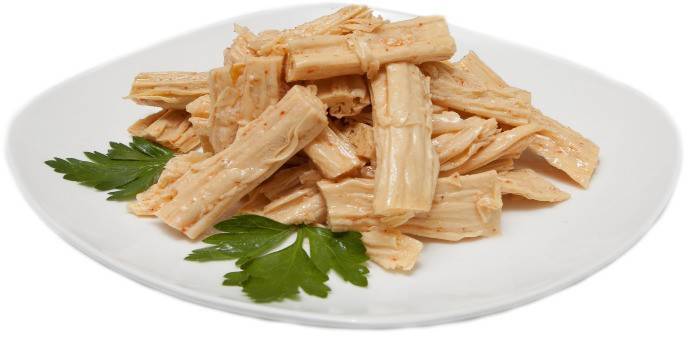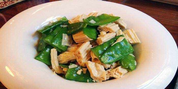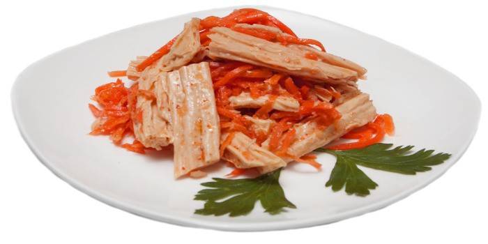 El producto semiacabado coreano no tiene nada que ver con la famosa verdura. El espárrago es un producto seco de una forma alargada característica, obtenido de la leche de soja, que es popular en los países asiáticos. El sabor picante original del fuju lo convierte en una adición bienvenida a cualquier verdura. Un plato puede ocupar un lugar entre los productos dietéticos: por 100 gramos de ensalada preparada, solo 105-115 kcal. De qué está hecho el espárrago coreano y cómo sucede: