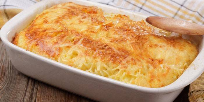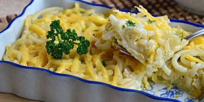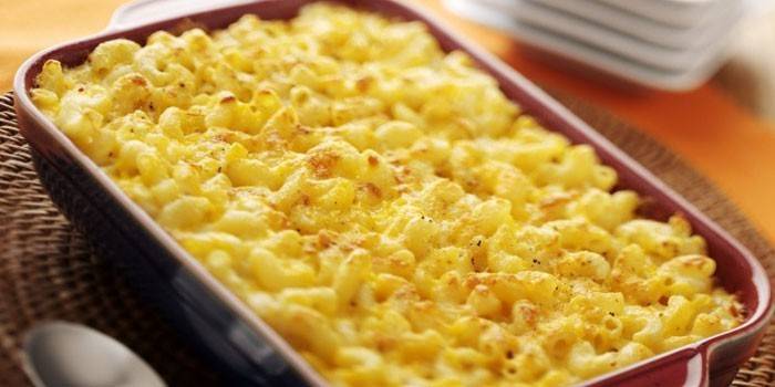 Estas pastas horneadas en el horno son una comida de dieta simple y equilibrada en la que los carbohidratos complejos se combinan con verduras. La tapa de queso es delgada, por lo que el contenido de grasa del plato es bajo. Trate de usar solo verduras livianas y acuosas: calabacín, tomates o cualquier tipo de repollo, para que la cazuela de pasta con queso resulte baja en calorías.