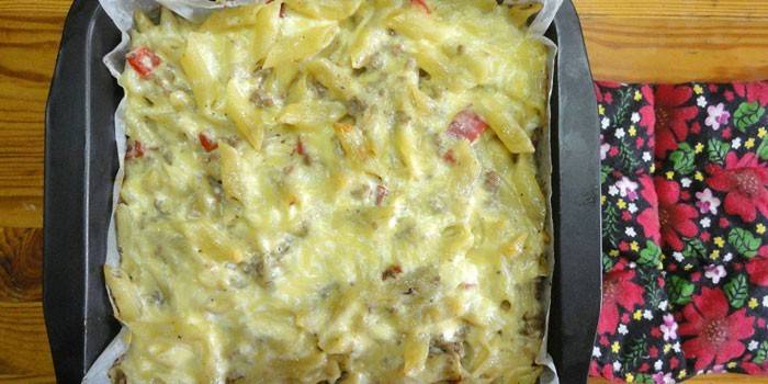 Este plato es casi un análogo de lasaña, pero simplificado y requiere menos tiempo. Además, no es necesario comprar láminas especiales: esta cazuela de pasta con carne picada se puede crear a base de tubos, arcos, espirales, etc.