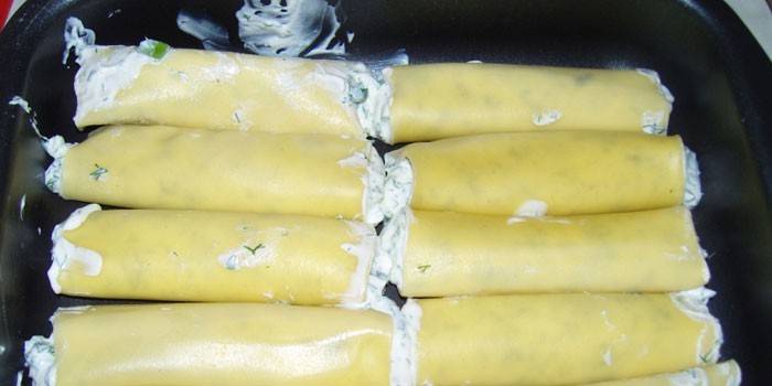 - Llene los canelones con relleno, colóquelos firmemente en el molde. Vierta agua hasta la mitad de la altura, cubra con crema agria. A la temporada.