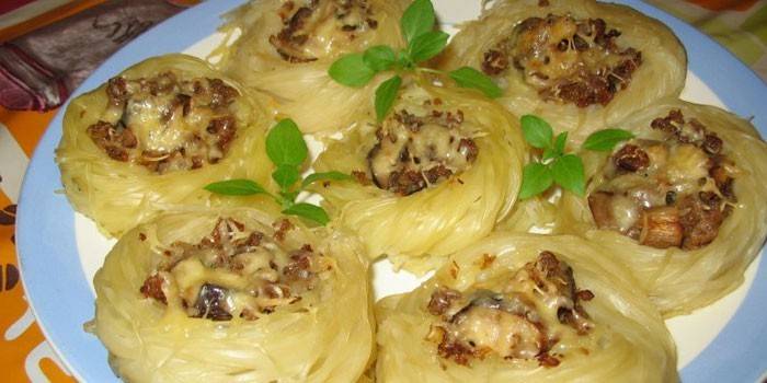 Hermosos nidos de pasta con carne picada en el horno son una excelente opción para una cena romántica, complementada con vino tinto seco. Si no puede encontrar la forma terminada, puede hervir espagueti o tallarines planos y torcer las bolas.