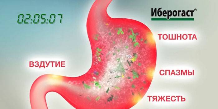 A droga é baseada em materiais vegetais. A ferramenta tem um efeito anti-inflamatório, normaliza o peristaltismo. Em ensaios clínicos, a fórmula de dosagem de Iberogast demonstrou inibir o desenvolvimento de 6 subtipos da bactéria Helicobacter pylori. O fitocomplexo reduz a intensidade de produção de ácido clorídrico, ulceração da mucosa gástrica.