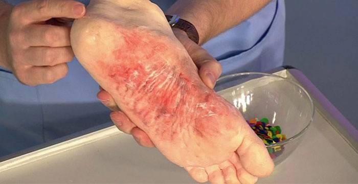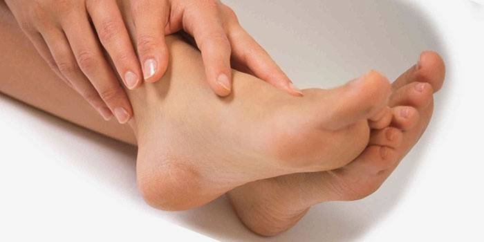 A forma disidrótica da lesão fúngica do pé é caracterizada pela aparência na pele de pequenas vesículas preenchidas com um líquido claro. Com inflamação severa, eles se abrem e formam uma superfície erodida. Peeling forte e esfoliação da epiderme é observado. Os sintomas de uma forma disidrótica são coceira intensa, transformando-se em sensação de queimação, inchaço e até aumento da temperatura.