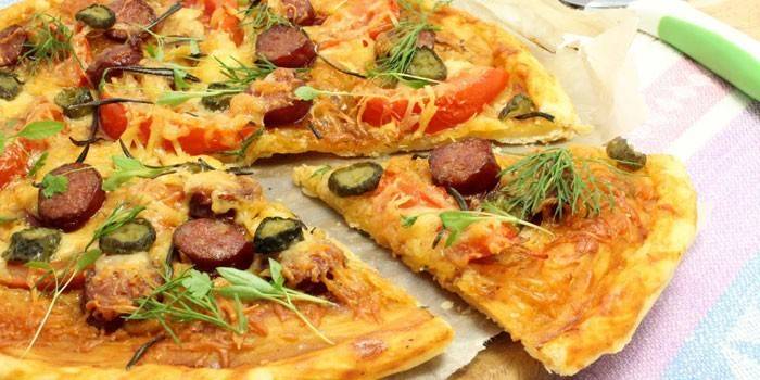 Magnífico e arejado, verifica-se pizza no microondas a partir de massa de levedura, que difere no processo de cozimento da opção quando o prato foi cozido no forno. Uma grande vantagem de usar um micro-ondas é misturar a massa com fermento sem provas subsequentes. 10 minutos suficientes para a massa subir e estar pronto para o cozimento subsequente.