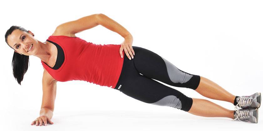 - Bočná lišta - kladte dôraz na vašu stranu, položenú na kolene ruky, držte polohu 30 - 60 sekúnd, potom vymeňte hornú končatinu.