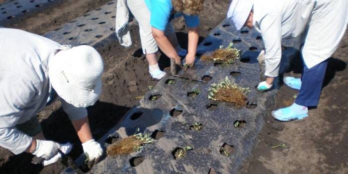 Pri výsadbe v radoch sú kríky umiestnené vo vzdialenosti 10 až 20 cm od seba a rozstup riadkov je asi 50 centimetrov. Táto metóda zahŕňa pravidelné uvoľňovanie pôdy, ničenie burín. Vysadená rastlina v radoch úspešne vyvíja a prináša plody po dobu 4 až 5 rokov.Problém výskytu burín je riešený predbežným kladením na pôdne vlákno - špeciálny krycí film s účinkom mulčovania.